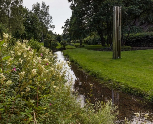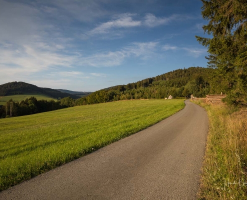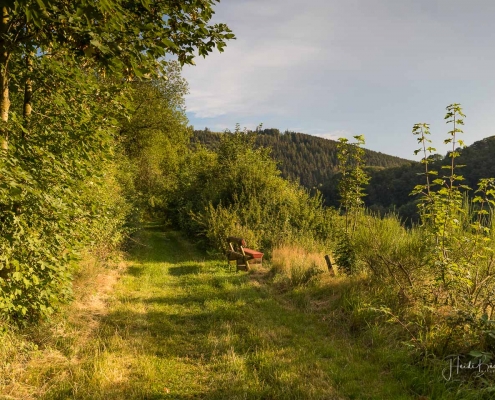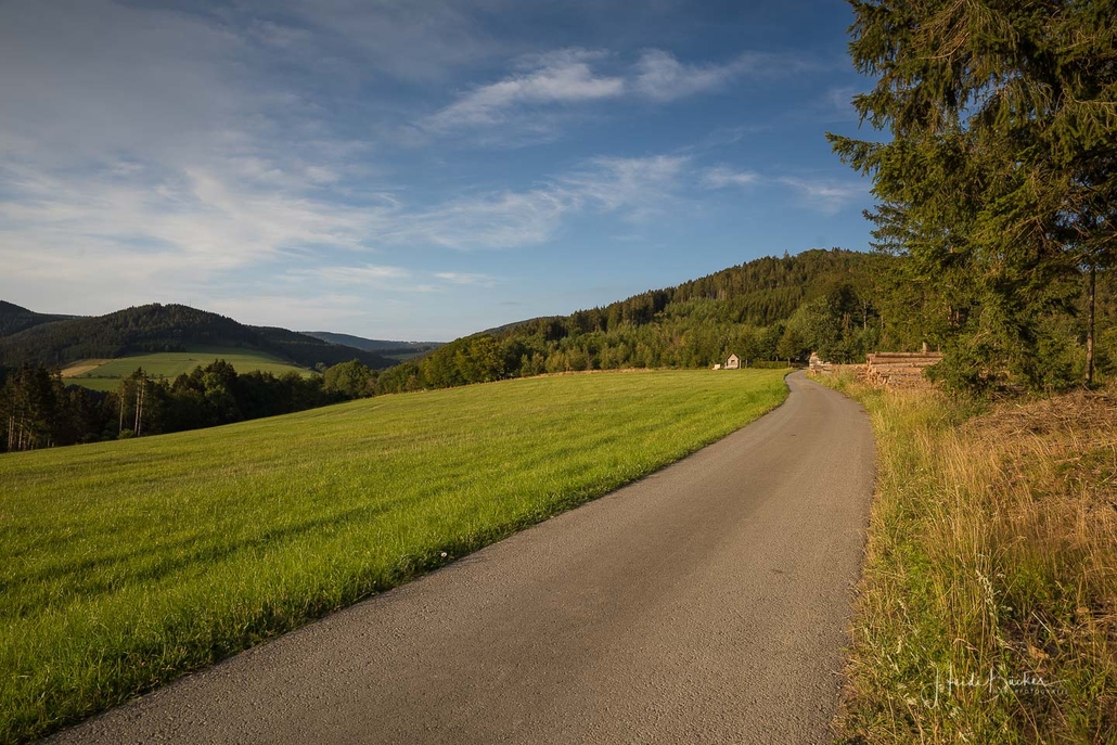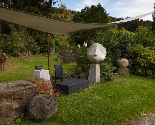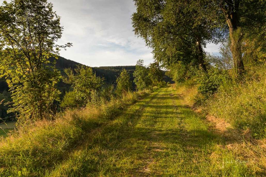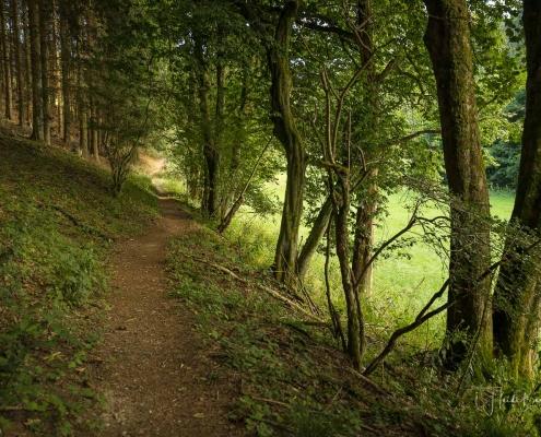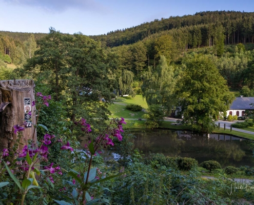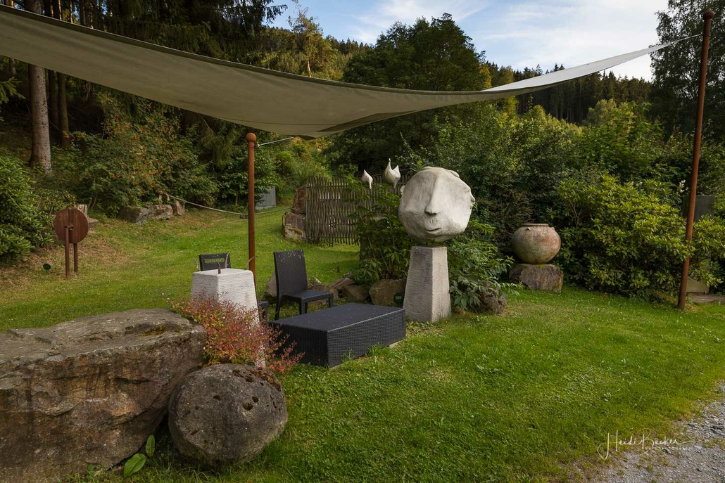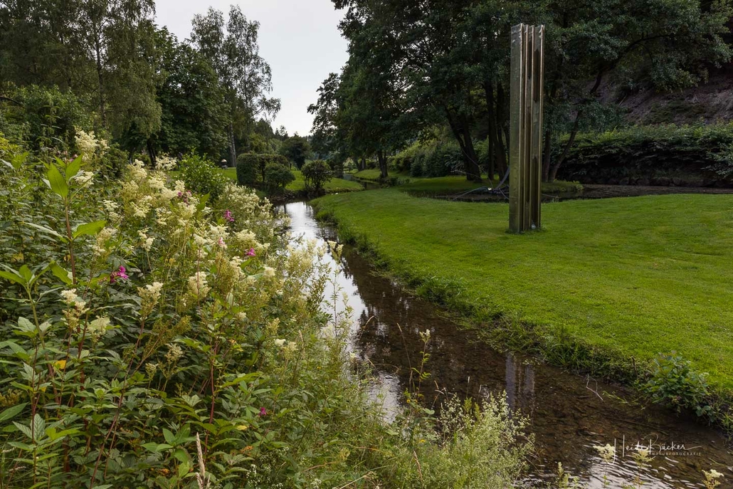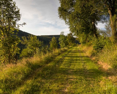 Vom Weißen Kreuz geht es weiter über einen urigen Wurzelpfad zurück nach Niedersorpe. Allerdings ist unsere Tour hier noch lange nicht zu Ende, denn wir lassen das Dorf links liegen und folgen den Wegweisern in Richtung Waldemei, wo sich die Kunstschmiede Klute befindet. Der Wanderweg führt mitten durch den beeindruckenden Ausstellungsgarten, wo wir einen Einblick in die Schmiedekunst erhalten. Das Gleiche erwartet uns nochmal in der Rellmecke, wo sich die Schmiedewelten Dünnebacke mit ihrer Handwerkskunst präsentieren. In der Rellmecke überqueren wir die Straße und gehen bei Dünnebacke hinterm Haus über eine Wiese, bis wir wieder auf einen Waldweg treffen. Ab hier wandern wir über naturnahe Pfade und Wege mit weiteren schönen und abwechslungsreichen Aussichten – diesmal auf der gegenüberliegenden Talseite der Sorpe – zurück zum Ausgangspunkt unserer Wanderung nach Niedersorpe.