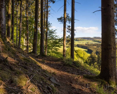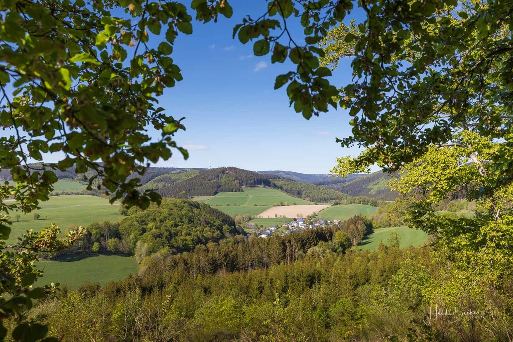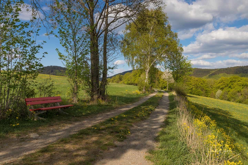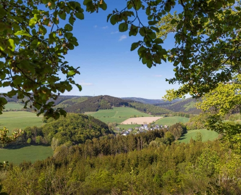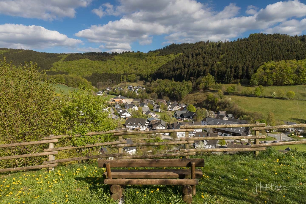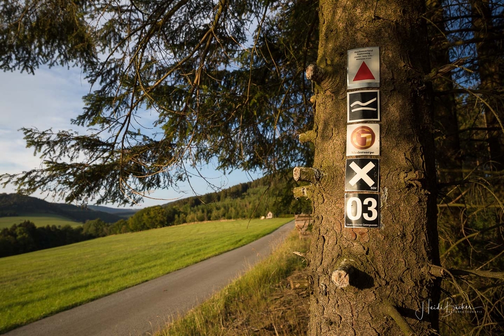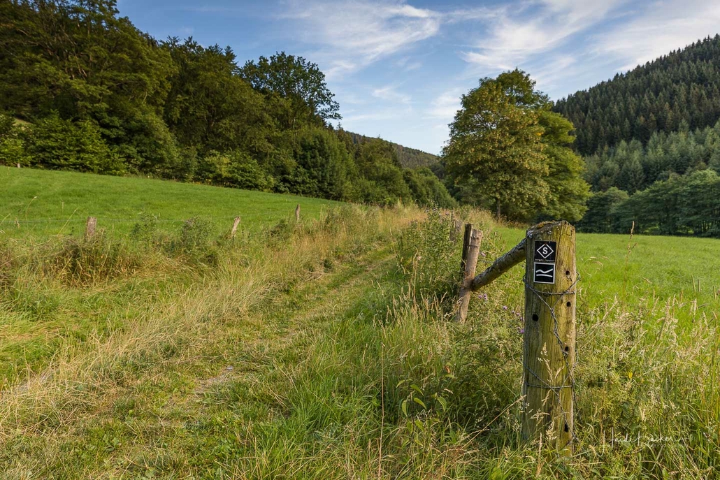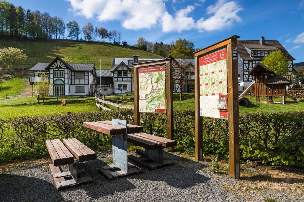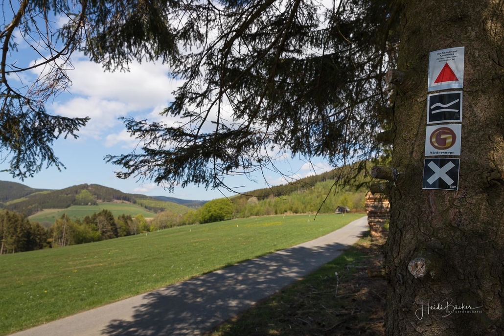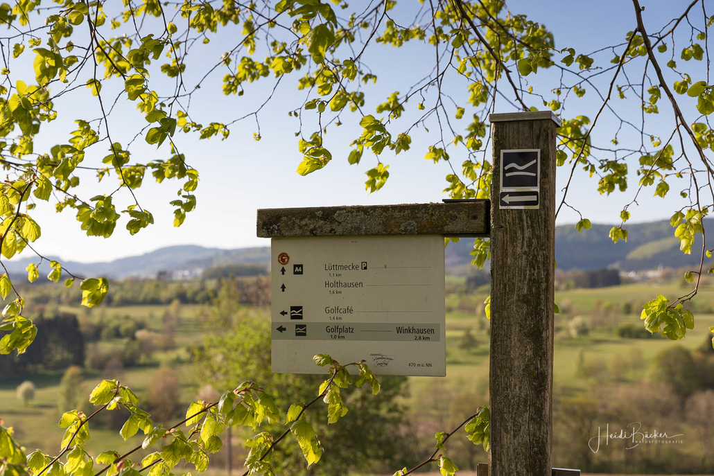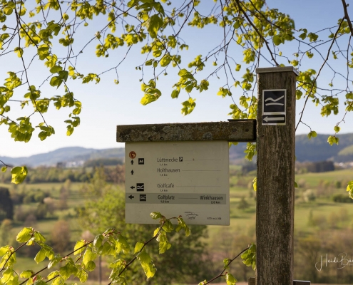 Wir starten am Wanderparkplatz in Niedersorpe, direkt neben Müller´s Hof und wandern die Rundtour entgegen dem Uhrzeigersinn. Zuerst gehen wir leicht bergan über einen schmalen Pfad direkt neben der Landstraße und linksseitig des Landgasthofs Wulbeck. Nach ca. 200 Metern biegt der Pfad nach links auf einen Wiesenweg ab und kurz darauf bietet sich schon eine erste tolle Aussicht auf das idyllische Bundesgolddorf. Von nun an geht es oberhalb von Niedersorpe durch Buchenwald und über abwechslungsreiche Wald- und Wiesenwege bis Winkhausen. Zwischenzeitlich bieten sich immer wieder herrliche Aussichten auf die umliegende Landschaft, den Nachbarort Holthausen und auf den Schmallenberger Golfplatz. Von dort wandern wir am Golfcafé vorbei und bleiben oberhalb von Winkhausen auf dem Wanderweg bis ein kleiner Trampelpfad nach rechts abbiegt.