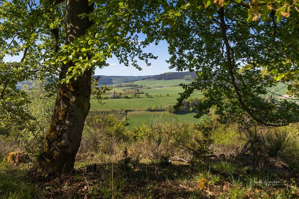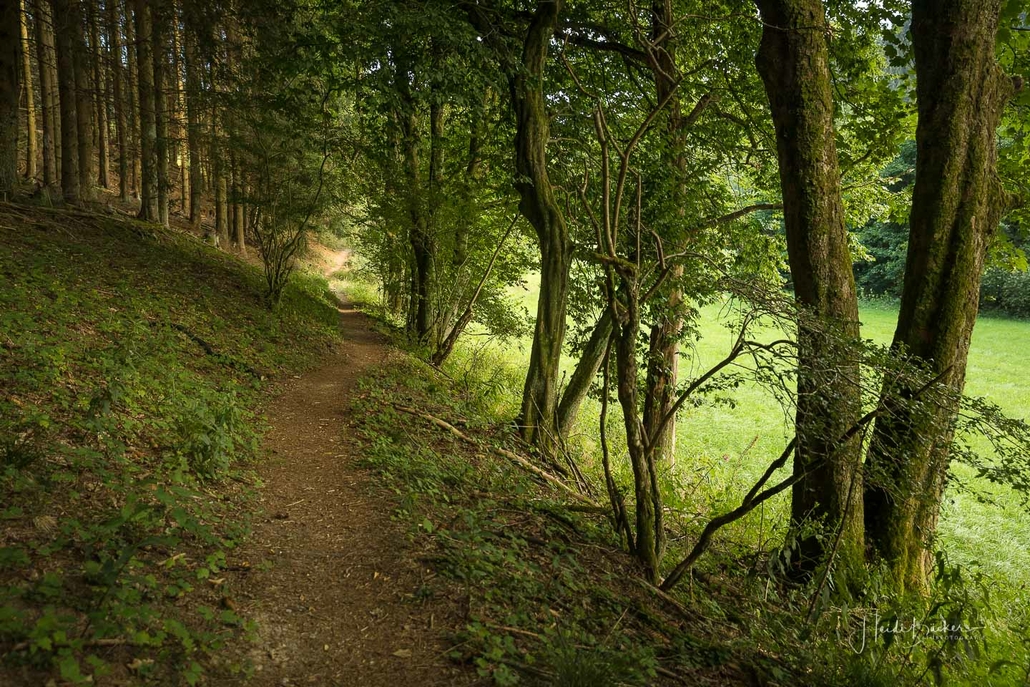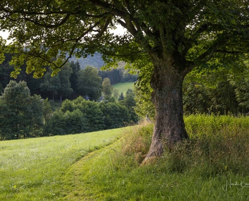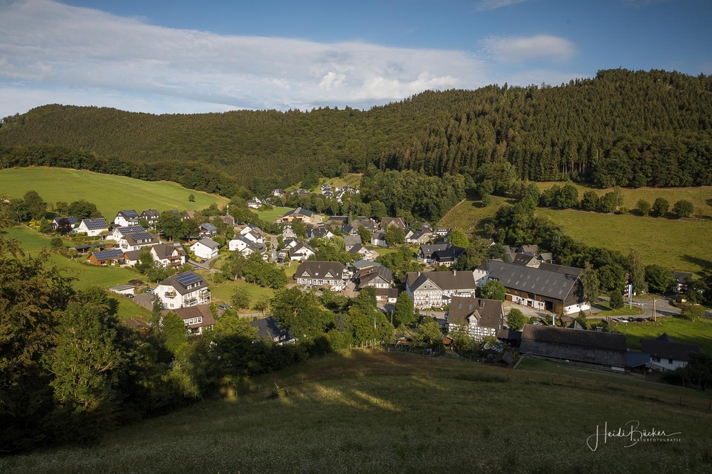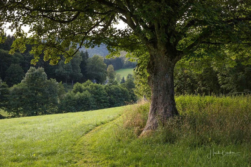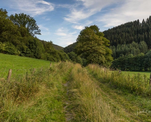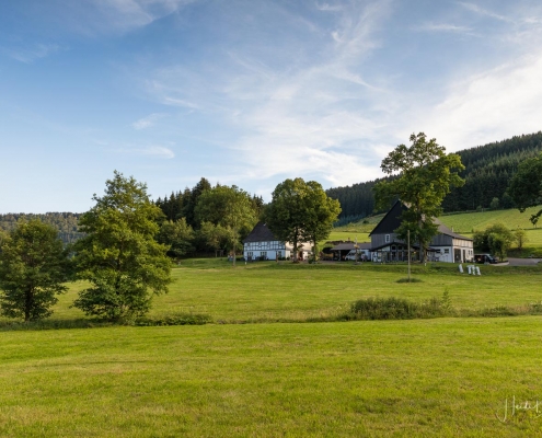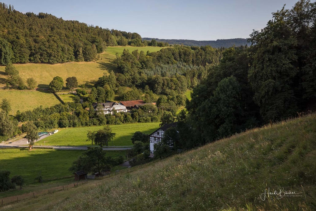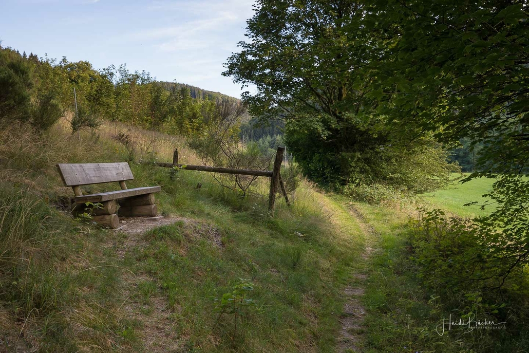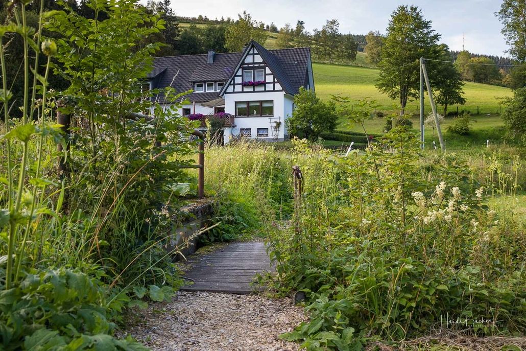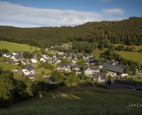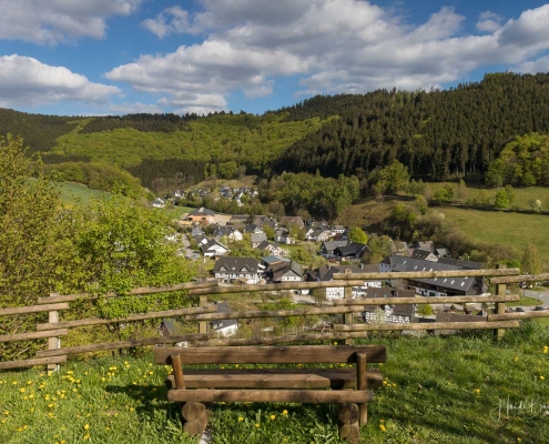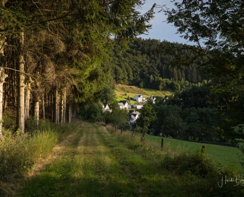 Wir starten am Wanderparkplatz in Niedersorpe, direkt neben Müller´s Hof und wandern die Rundtour entgegen dem Uhrzeigersinn. Zuerst gehen wir leicht bergan über einen schmalen Pfad direkt neben der Landstraße und linksseitig des Landgasthofs Wulbeck. Nach ca. 200 Metern biegt der Pfad nach links auf einen Wiesenweg ab und kurz darauf bietet sich schon eine erste tolle Aussicht auf das idyllische Bundesgolddorf. Von nun an geht es oberhalb von Niedersorpe durch Buchenwald und über abwechslungsreiche Wald- und Wiesenwege bis Winkhausen. Zwischenzeitlich bieten sich immer wieder herrliche Aussichten auf die umliegende Landschaft, den Nachbarort Holthausen und auf den Schmallenberger Golfplatz. Von dort wandern wir am Golfcafé vorbei und bleiben oberhalb von Winkhausen auf dem Wanderweg bis ein kleiner Trampelpfad nach rechts abbiegt.