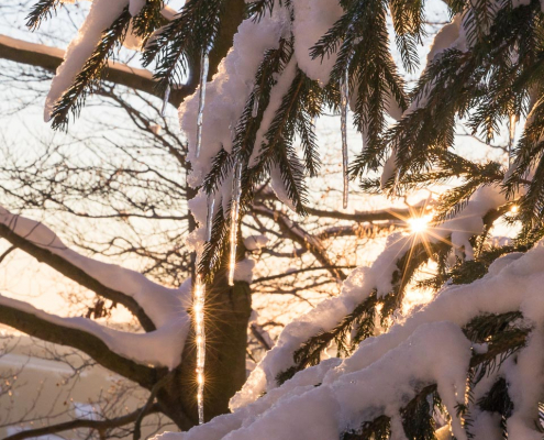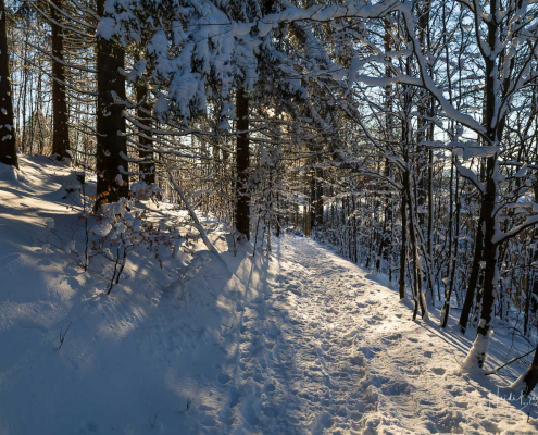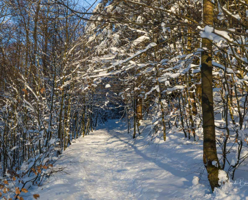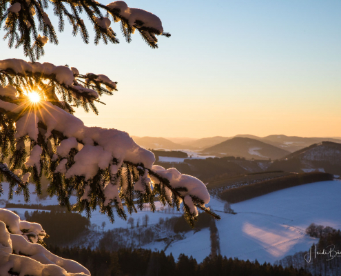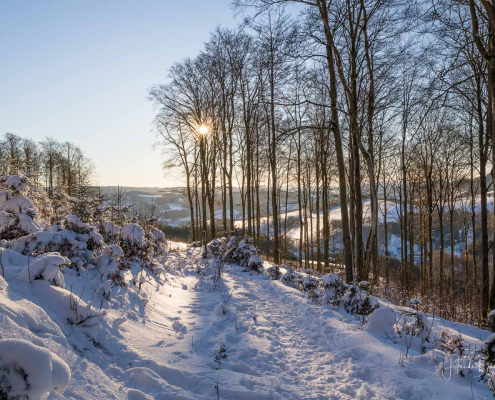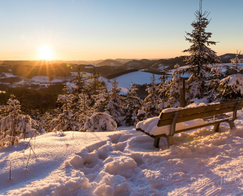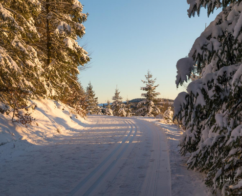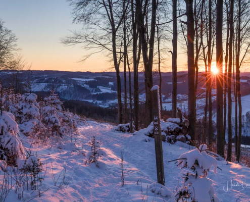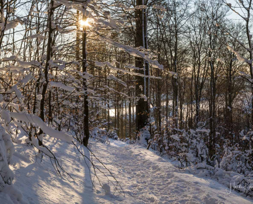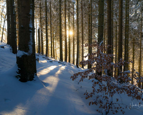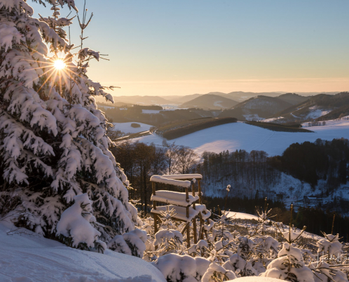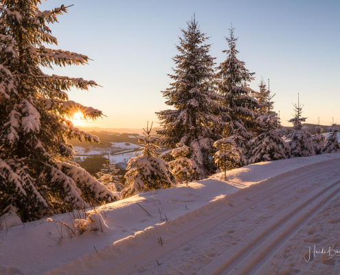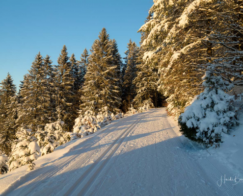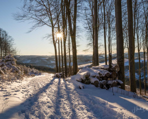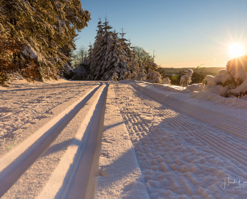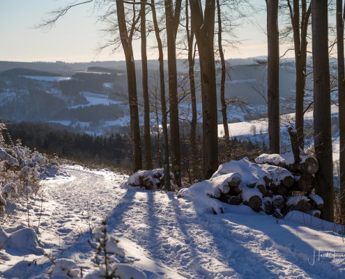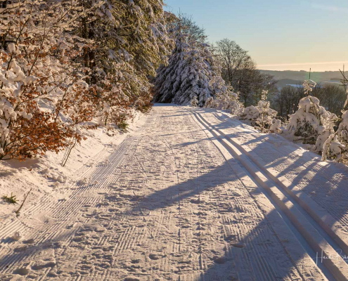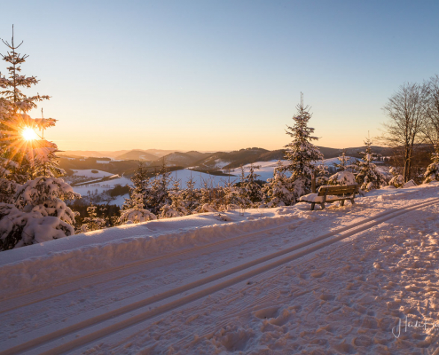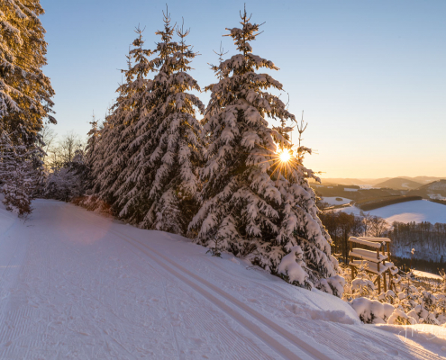 ** Die nachfolgenden Bilder sind an einem Wintertag im Januar spätnachmittags mit viel Schnee entstanden. Leider liegt zur Zeit auf dem Hohen Knochen nicht so viel Schnee, dass eine Loipe gespurt werden kann. Infos zu gespurten Loipen stehen auf der Website des Skilanglaufzentrums Westfeld-Ohlenbach.
