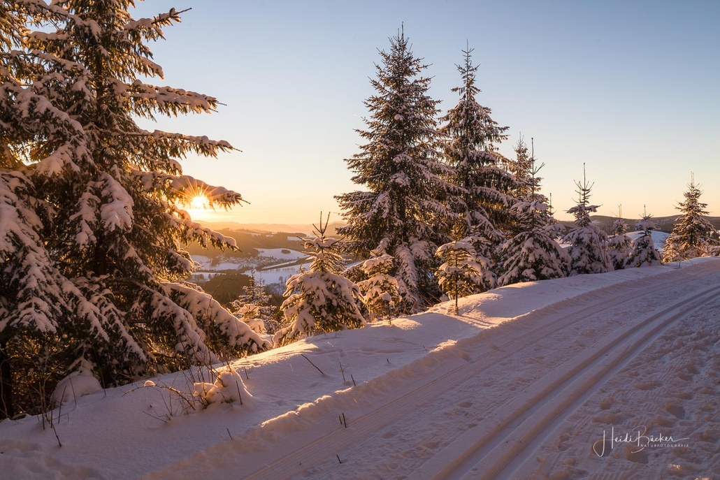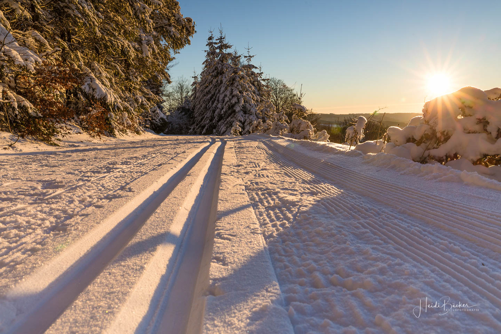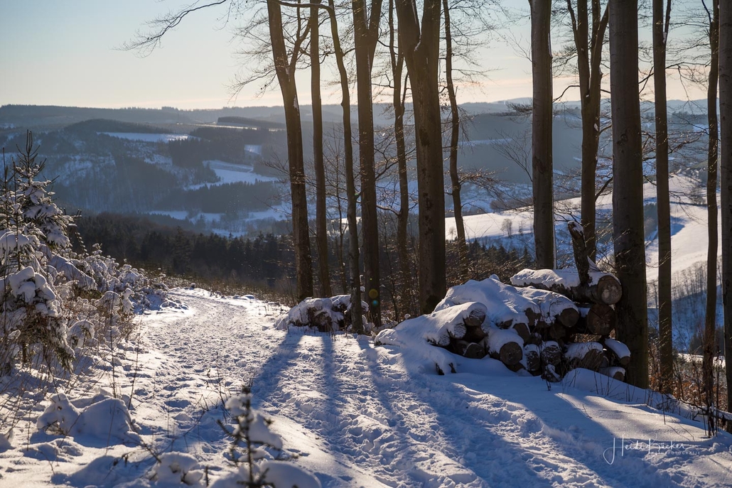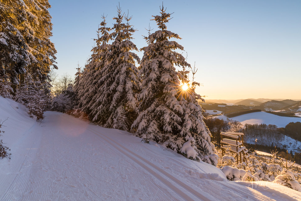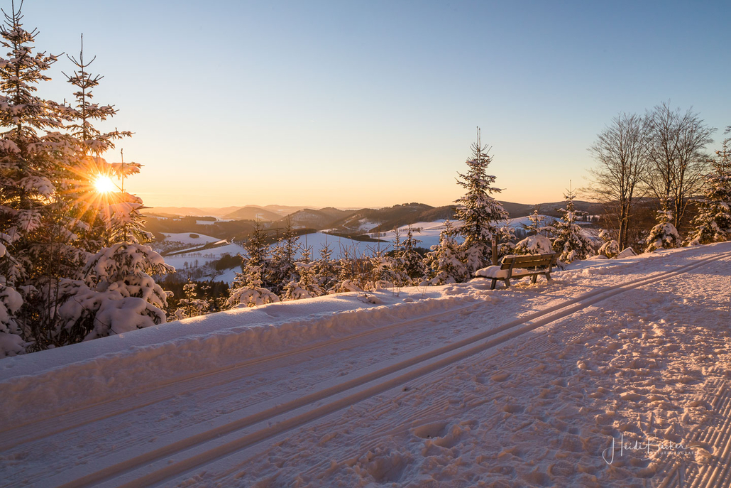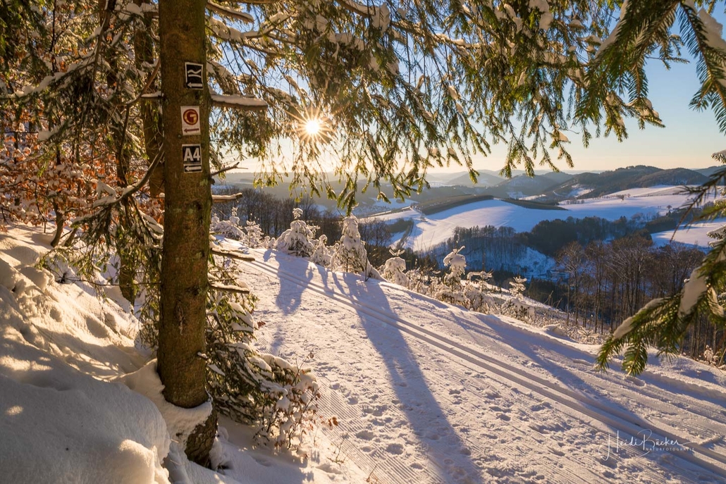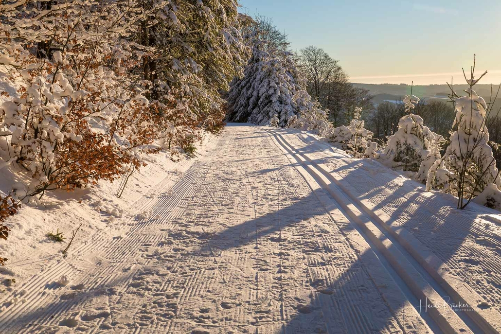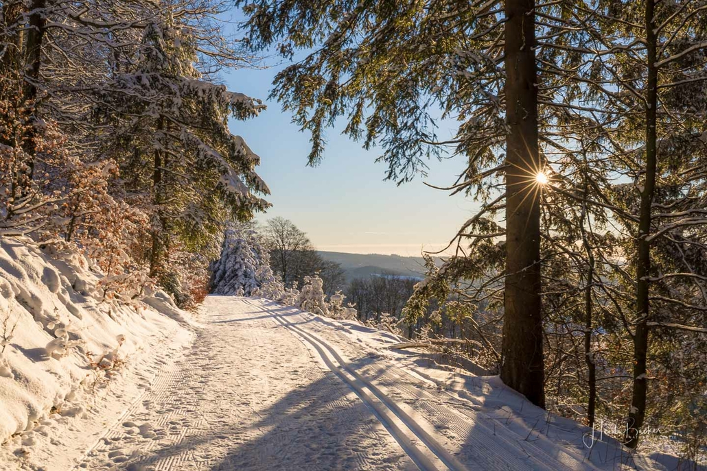 ** Die nachfolgenden Bilder sind an einem Wintertag im Januar spätnachmittags mit viel Schnee entstanden. Leider liegt zur Zeit auf dem Hohen Knochen nicht so viel Schnee, dass eine Loipe gespurt werden kann. Infos zu gespurten Loipen stehen auf der Website des Skilanglaufzentrums Westfeld-Ohlenbach.
