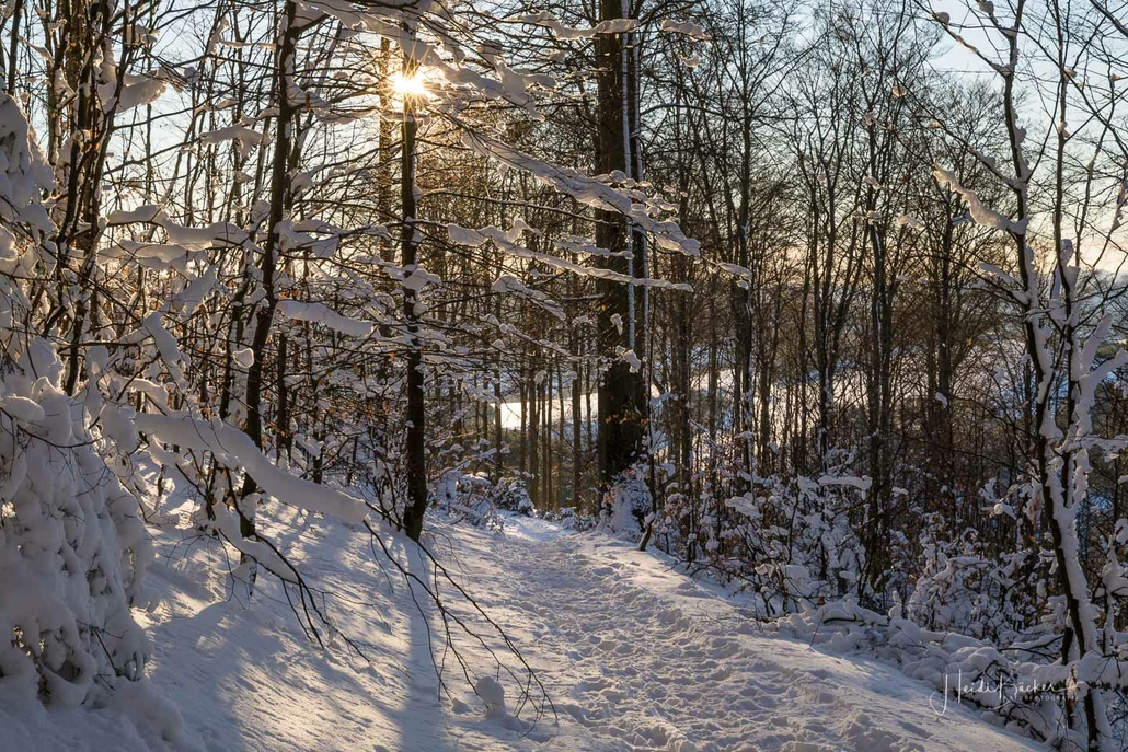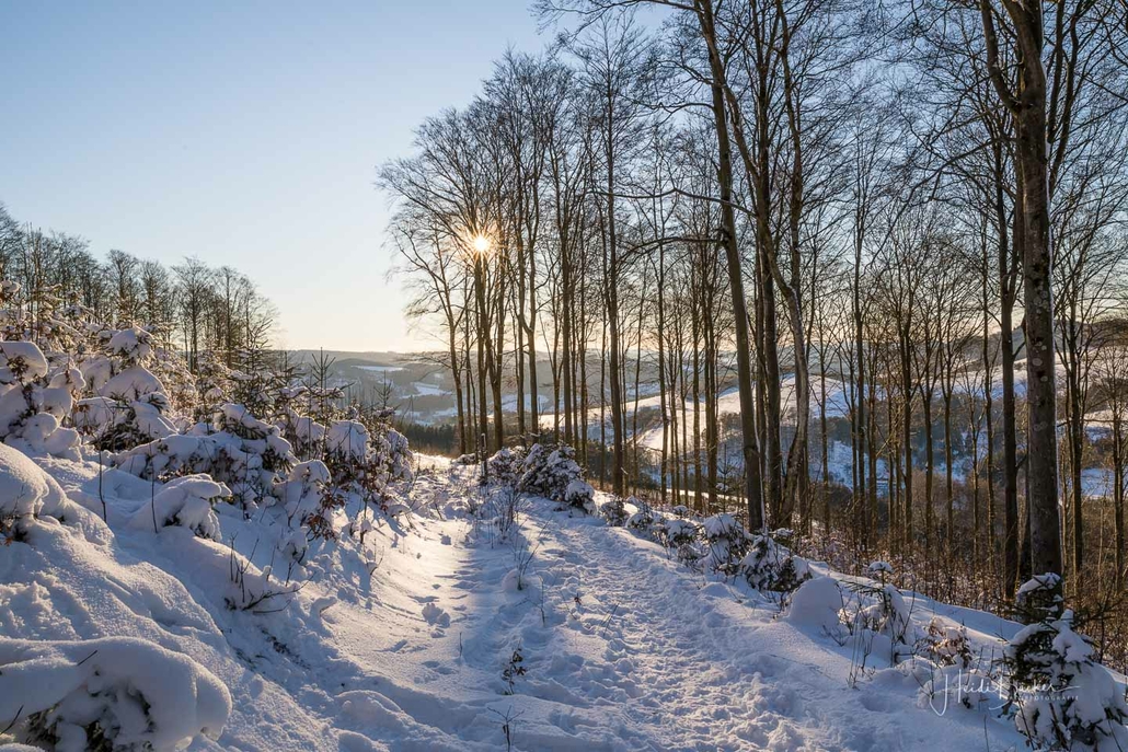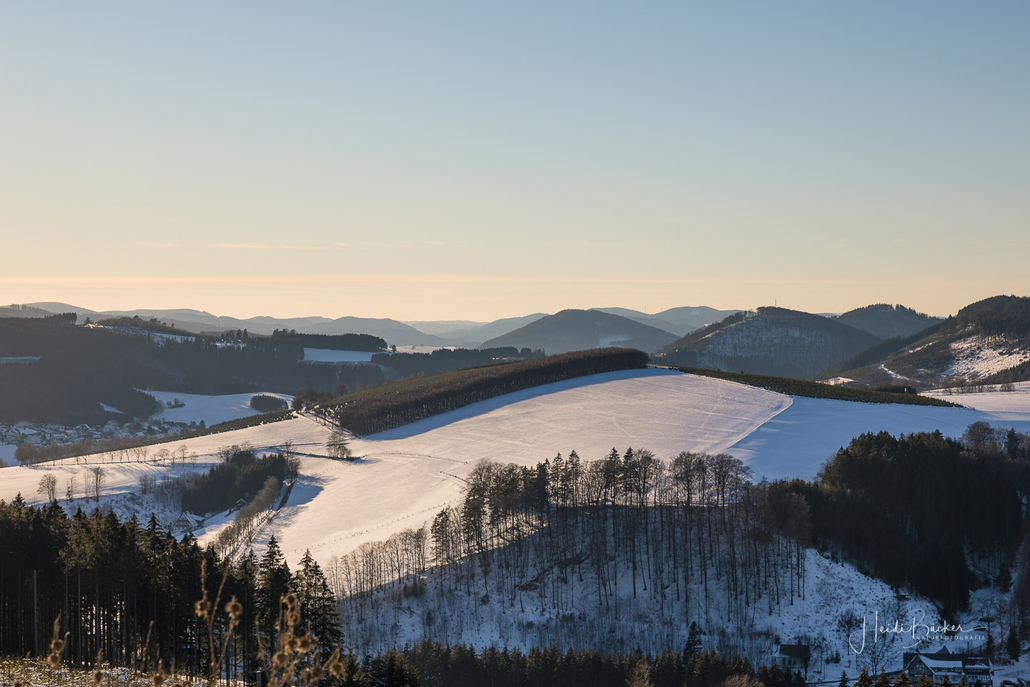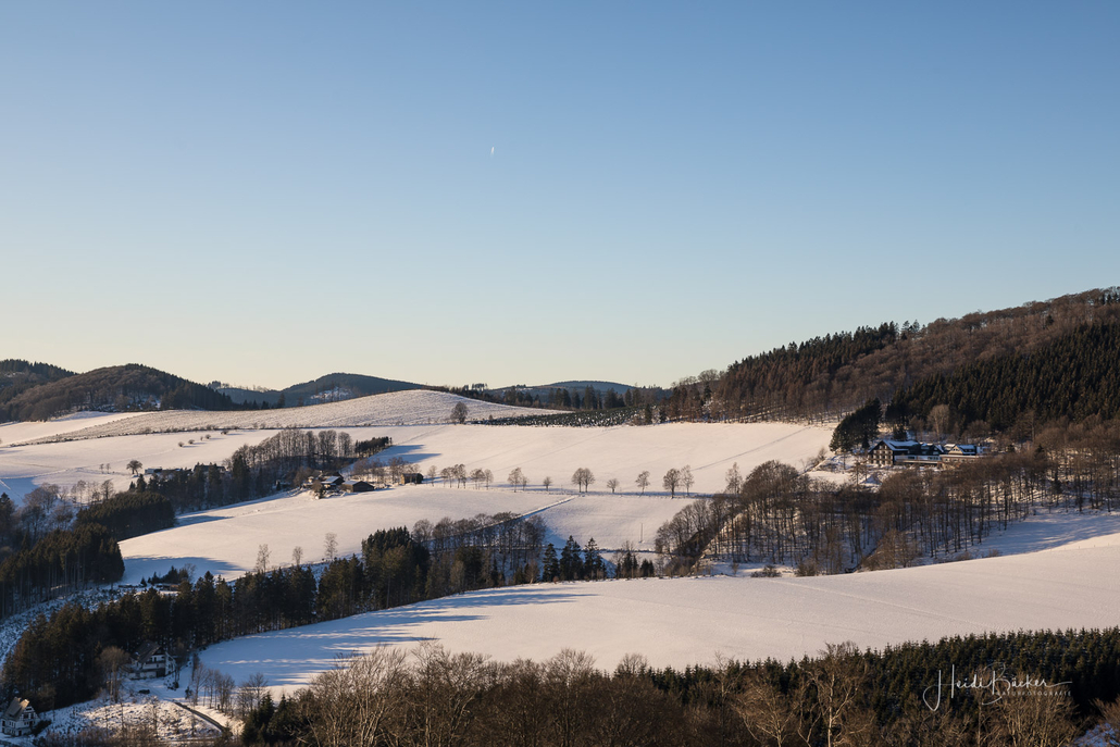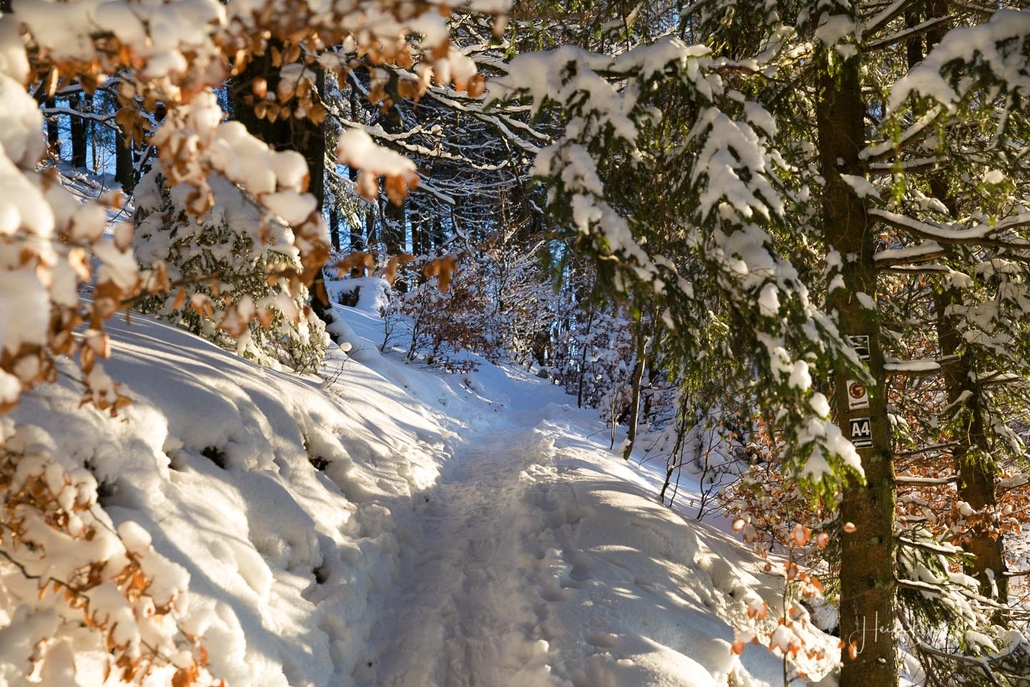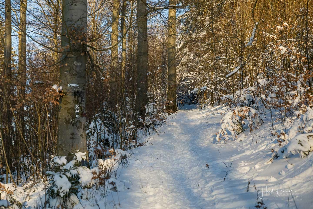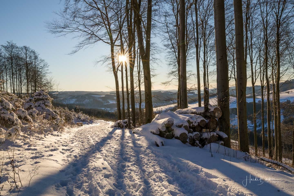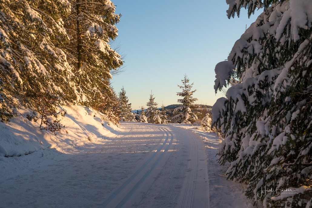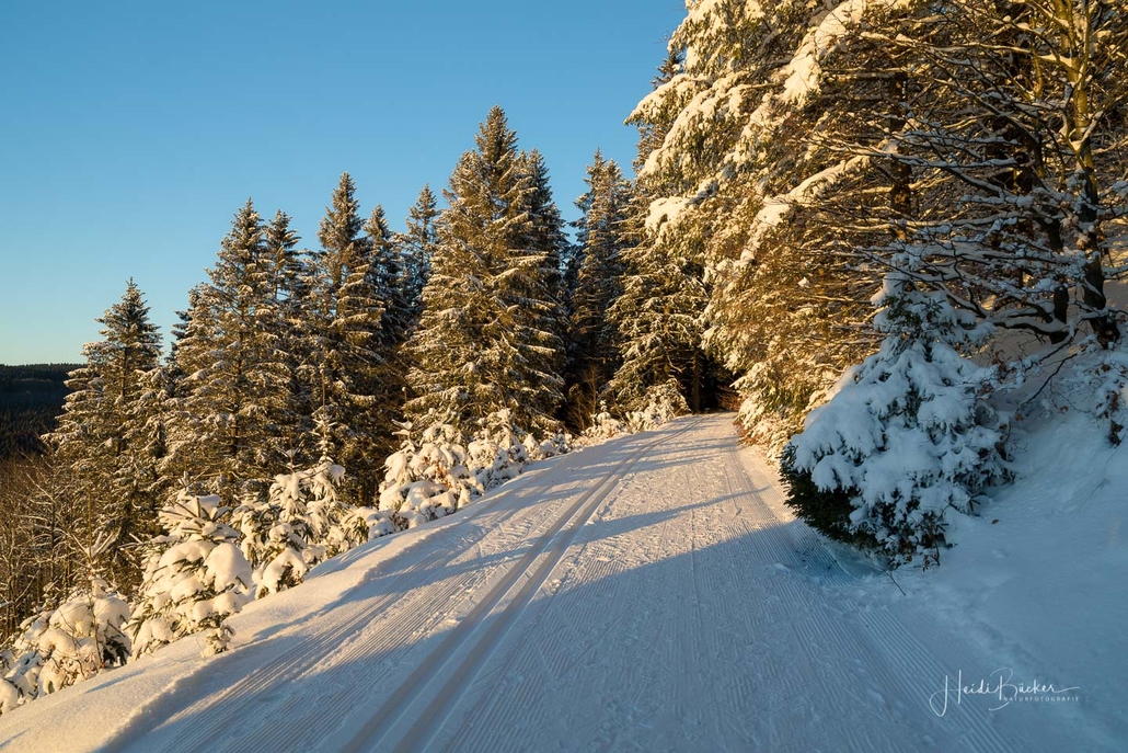 ** Die nachfolgenden Bilder sind an einem Wintertag im Januar spätnachmittags mit viel Schnee entstanden. Leider liegt zur Zeit auf dem Hohen Knochen nicht so viel Schnee, dass eine Loipe gespurt werden kann. Infos zu gespurten Loipen stehen auf der Website des Skilanglaufzentrums Westfeld-Ohlenbach.
