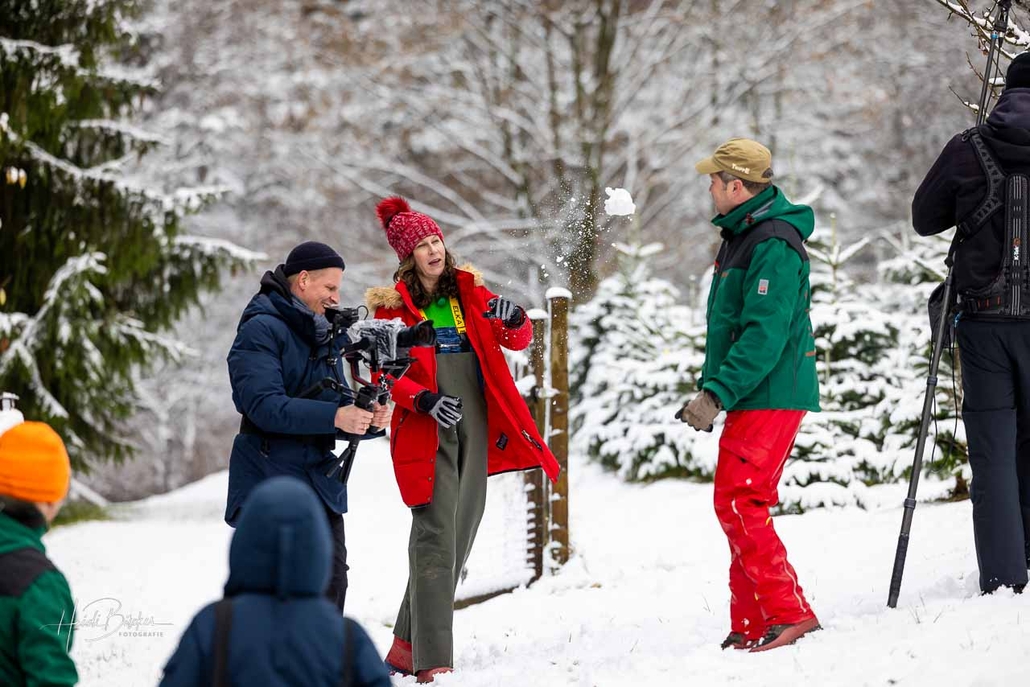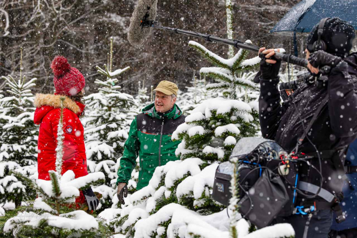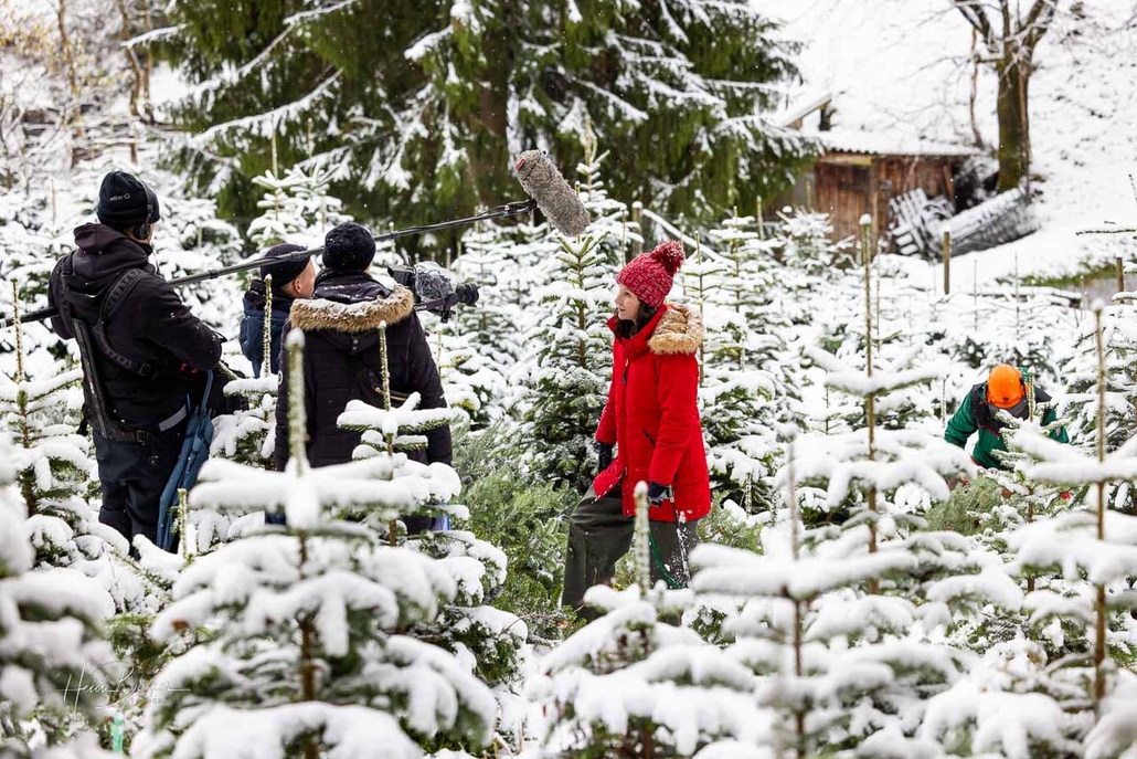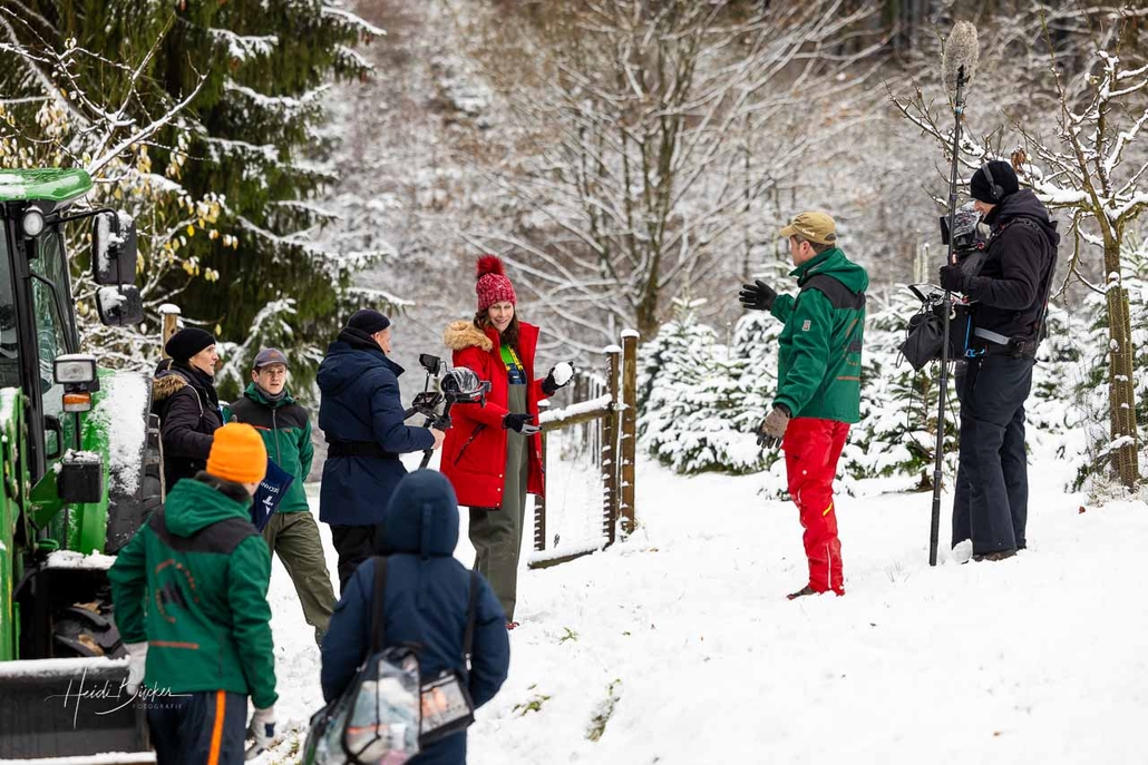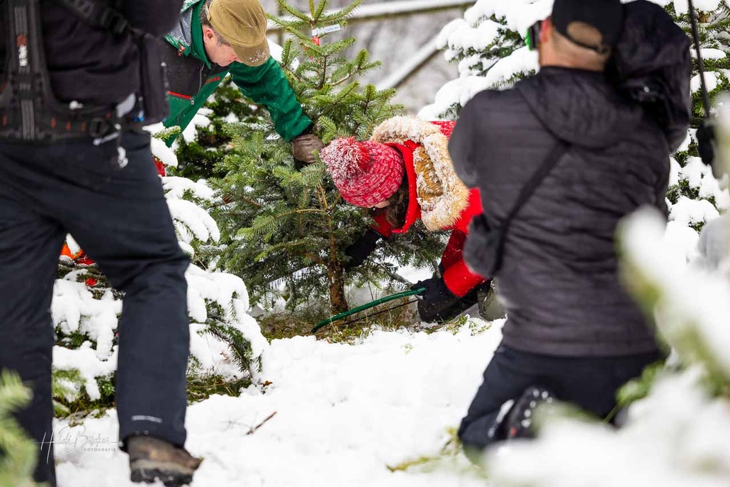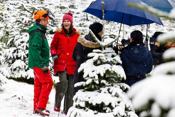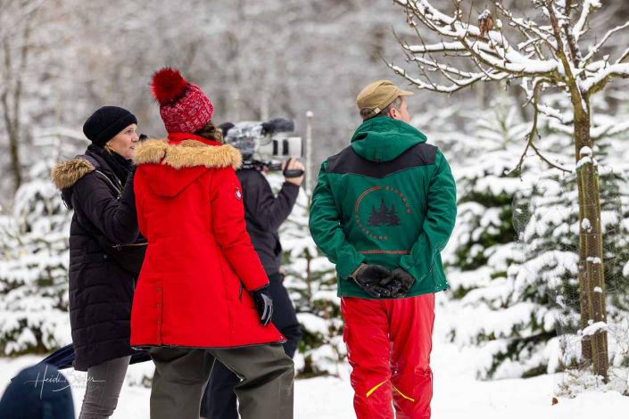 Schon frühmorgens ging´s los. Es war lausig kalt und schneite fast ununterbrochen. Für Ende November lag bereits ungewöhnlich viel Schnee, was für die Weihnachtsbaumernte und den Filmdreh nicht so optimal war. Mit Blick in die Natur zauberte der Schnee allerdings eine märchenhafte Stimmung.
