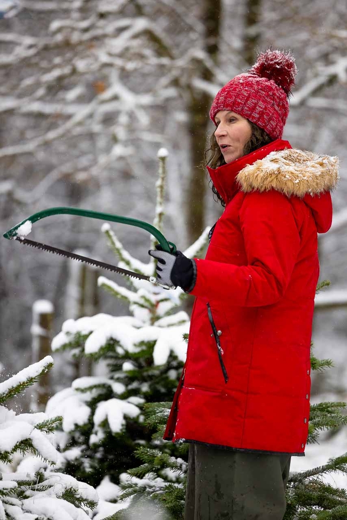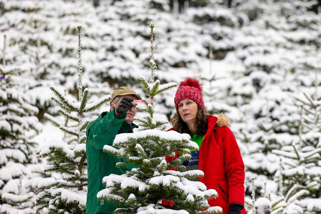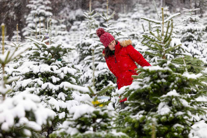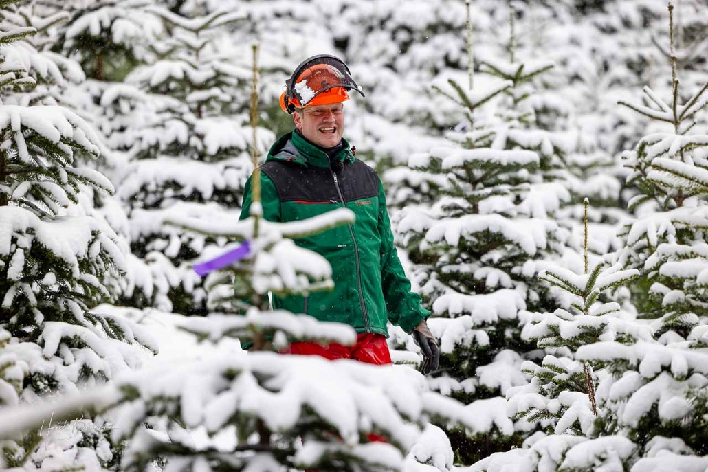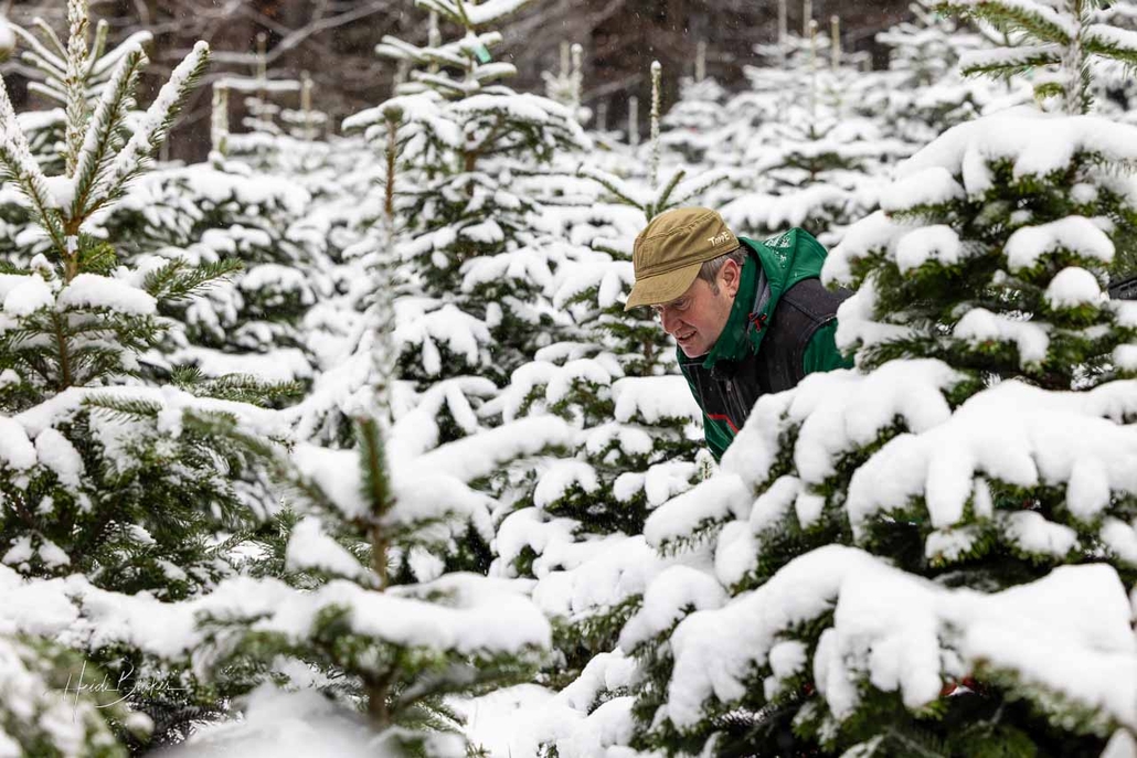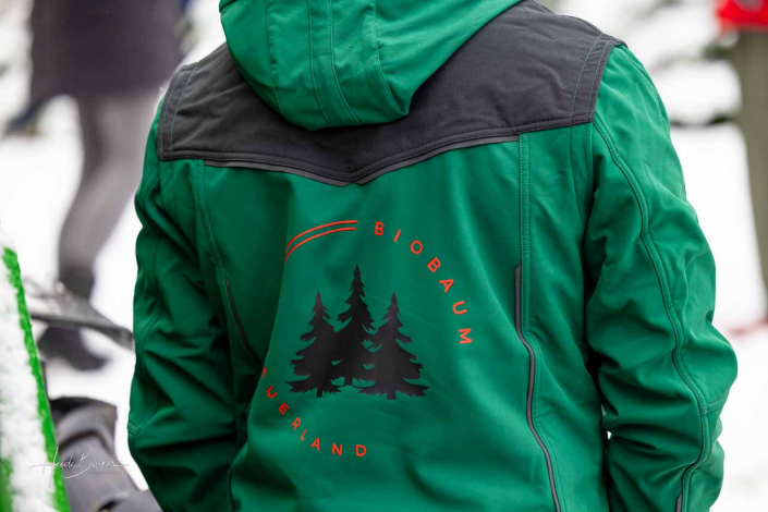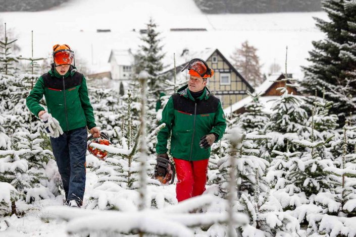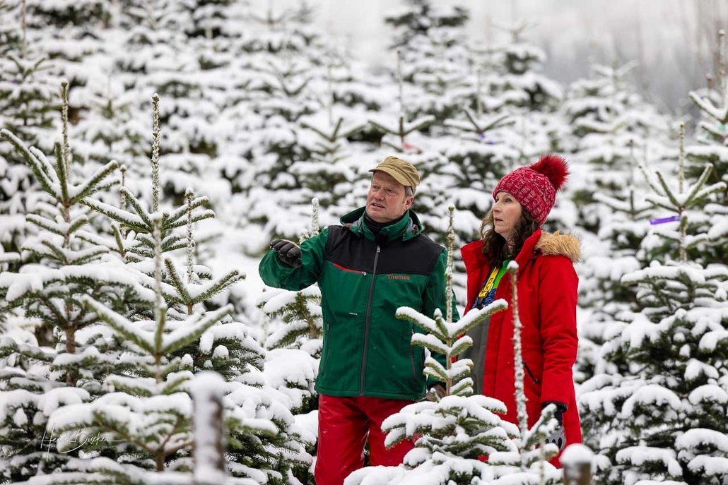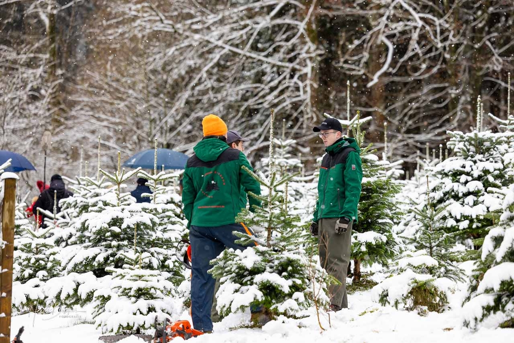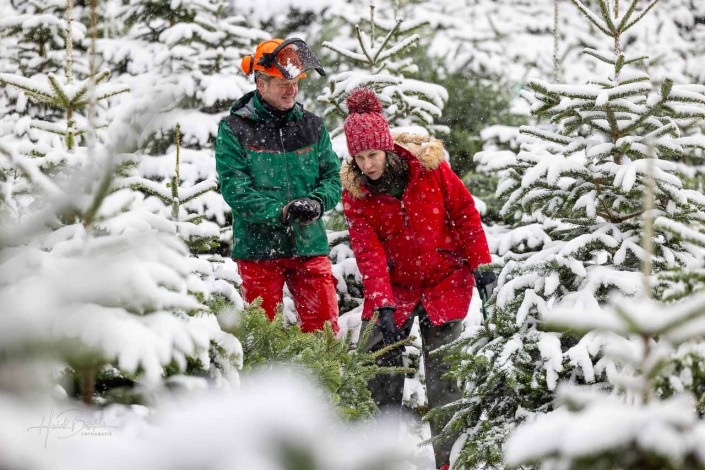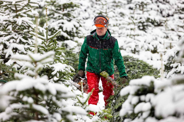 Für meinen Fotoauftrag war die stimmungsvolle Winterlandschaft mit den schneebedeckten kleinen Tannen einfach genial. Thomas und Sabine stachen mit ihrer auffällig bunten Kleidung aus der weißen Landschaft besonders gut hervor. Außerdem waren alle gut gelaunt! Ausgerüstet mit Hand- und Motorsäge ging es durch die verschneite Weihnachtsbaumkultur und es wurden Bio-Weihnachtsbäume ausgesucht, abgesägt und eingenetzt.