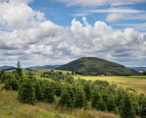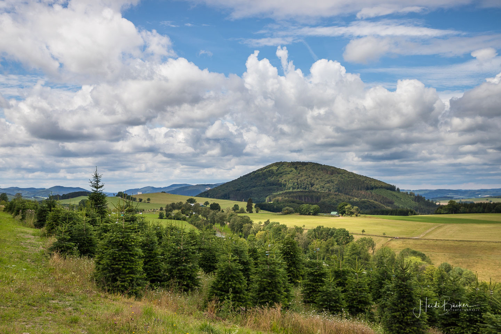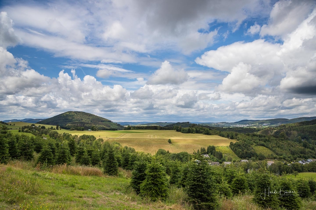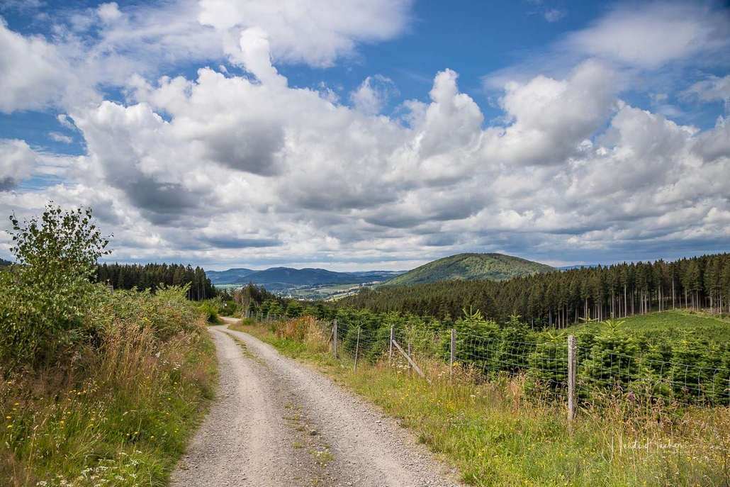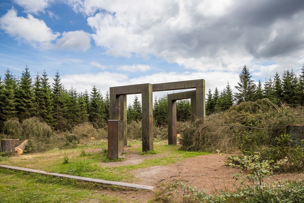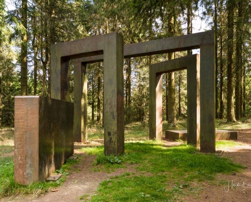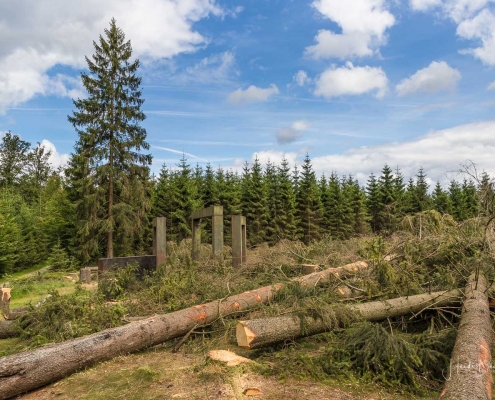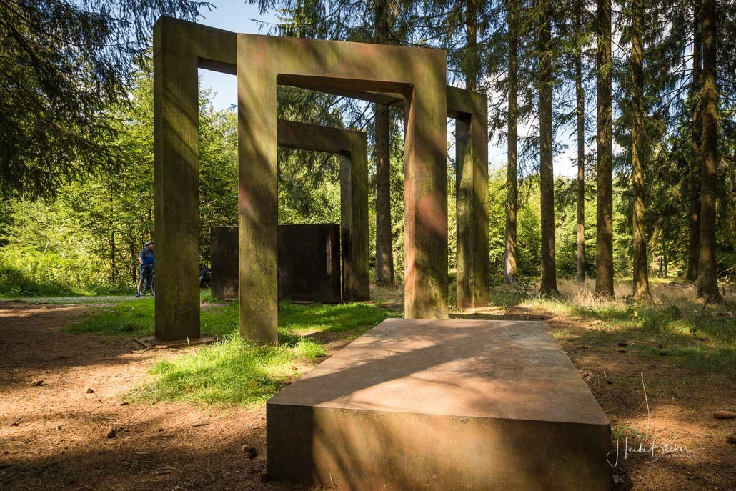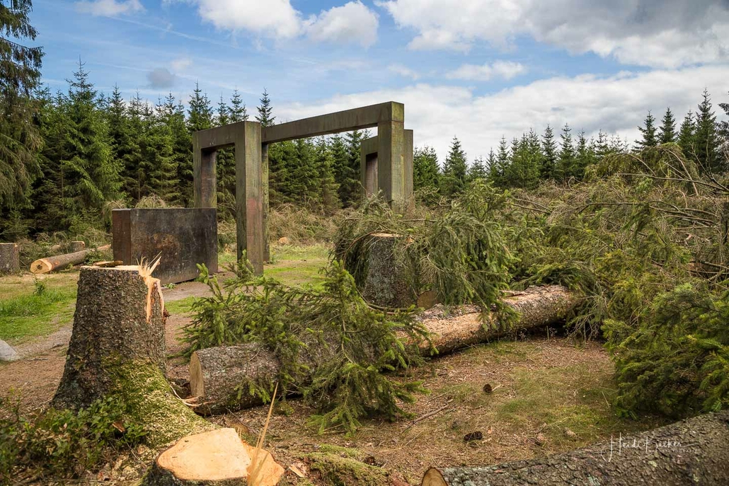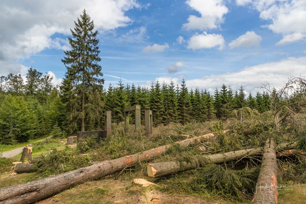 Unsere letzte Radtour führte uns über alt bekannte und neue Wege von Westfeld im Hochsauerland über Oberkirchen und Schanze bis nach Kühhude und zum Dödesberg im Wittgensteiner Land. Bis Kühhude ging es teils über den Waldskulpturenweg, der uns unter anderem auch an der Skulptur „Kein leichtes Spiel“ vorbeiführte. So, wie man sie kennt und im Prospekt beschrieben: „Umgeben von hohen Tannen…“, zeigte sich die vier Meter hohe Stahlskulptur gestern allerdings nicht mehr. Die hohen Tannen sind weg und es bot sich uns eine vollkommen neue Ansicht.